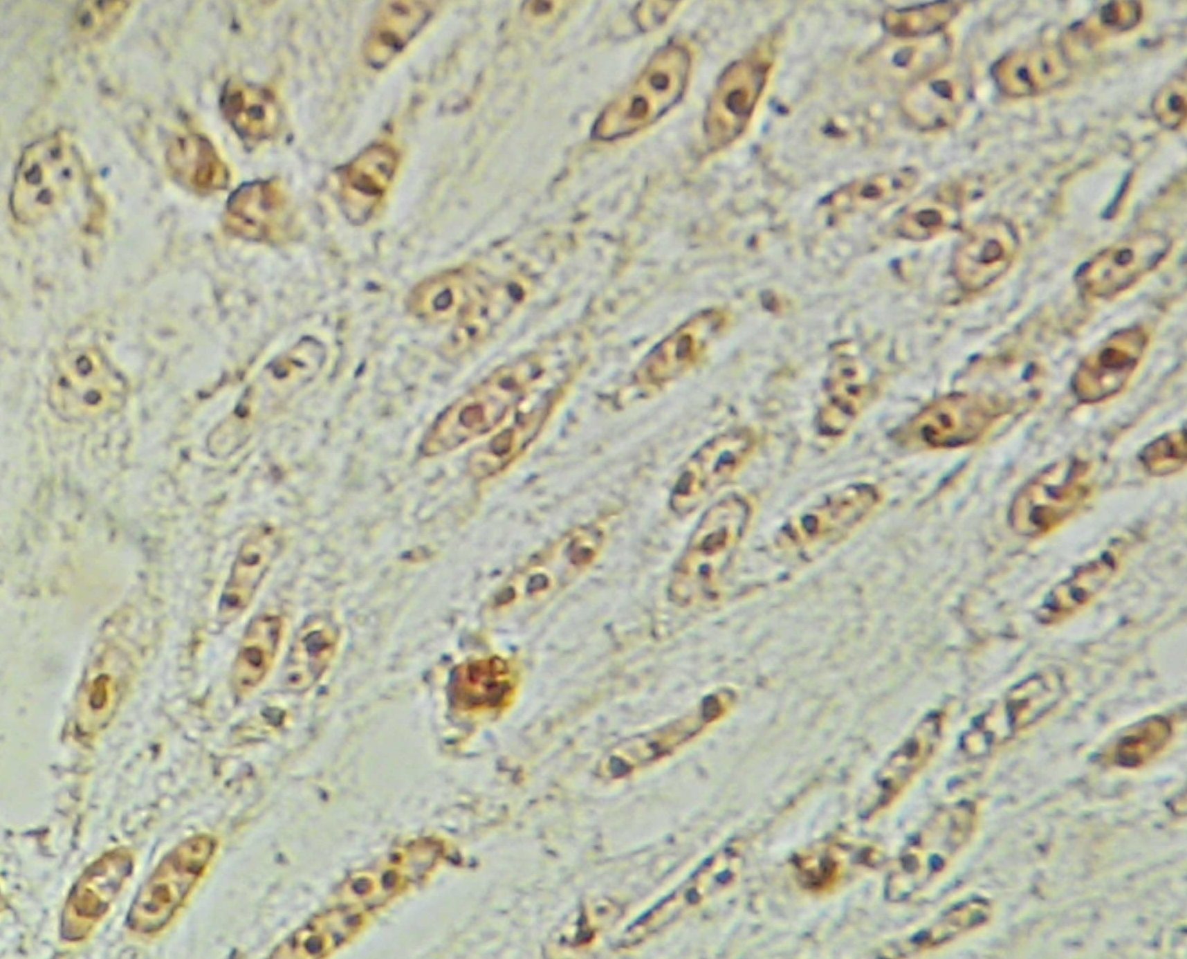 【染色原理】細胞中的堿性磷酸酶,在堿性緩沖液中,催化底物水解,生成物進而與一種穩定的重氮鹽偶聯,生成不溶性的偶氮染料,沉著于有CAKP活性的部位。染色結果為血涂片中細胞核呈紫藍色(蘇木素復染)或綠色(甲基綠復染),陽性者胞漿中出現紅至紅棕色顆粒,有些為棕褐色或咖啡色顆粒。