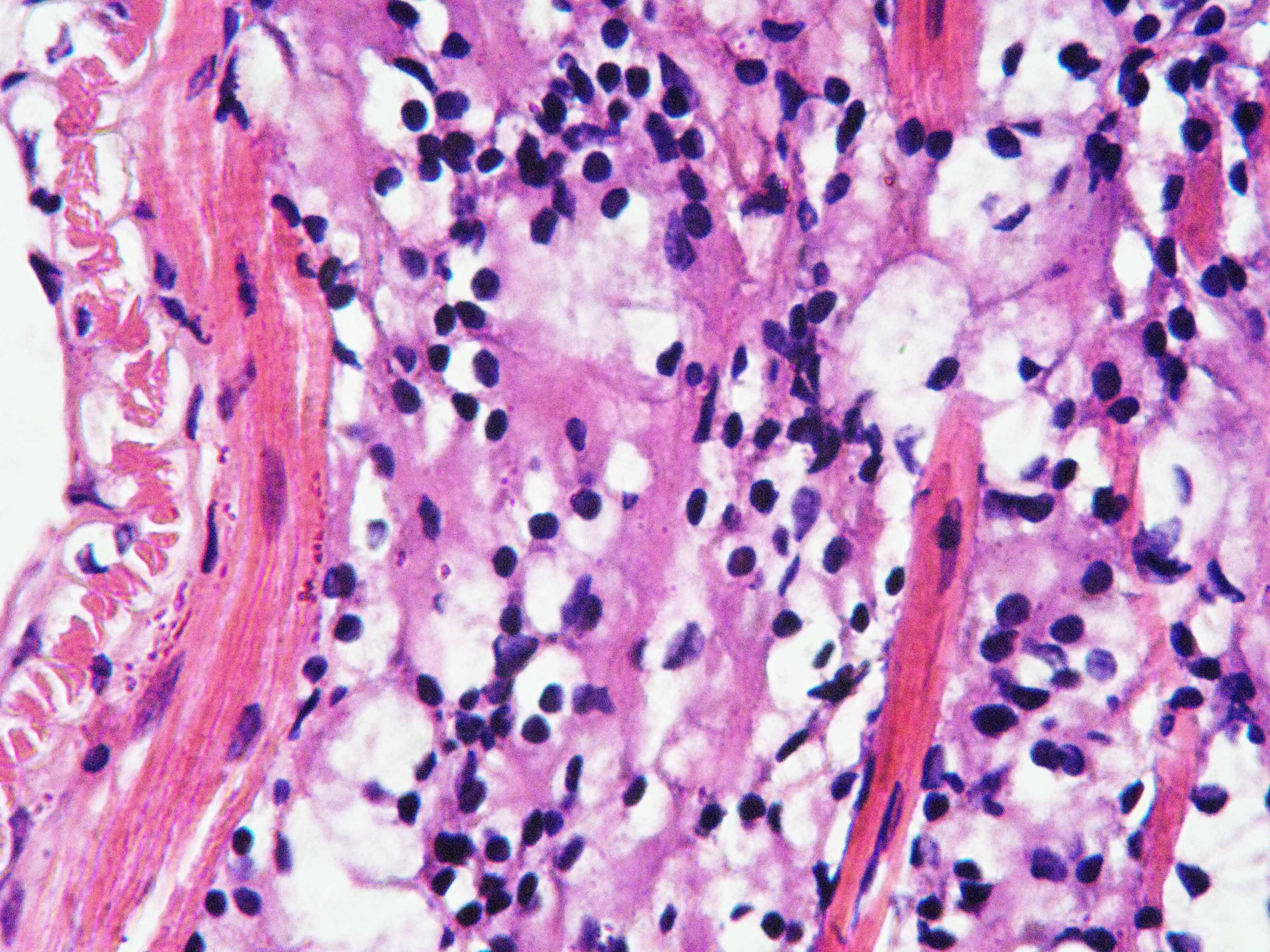 【染色原理】細胞中的細胞核是由酸性物質組成,它與堿性染料的親和力較強,而細胞漿則相反,含有堿性物質因而與酸性染料的親和力較大。因此,組織切片或細胞涂片經HE染色后,細胞核被染成自紫藍色,細胞漿、肌纖維、膠元纖維等染成不同程度的紅色,紅細胞則呈橙紅色。