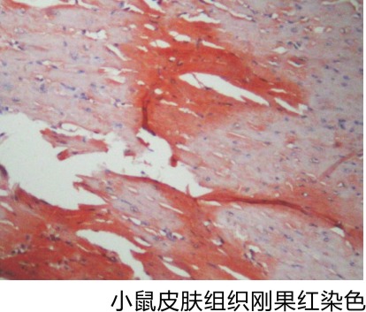【染色結(jié)果】淀粉樣物質(zhì)染色呈深紅色,胞核呈藍色。