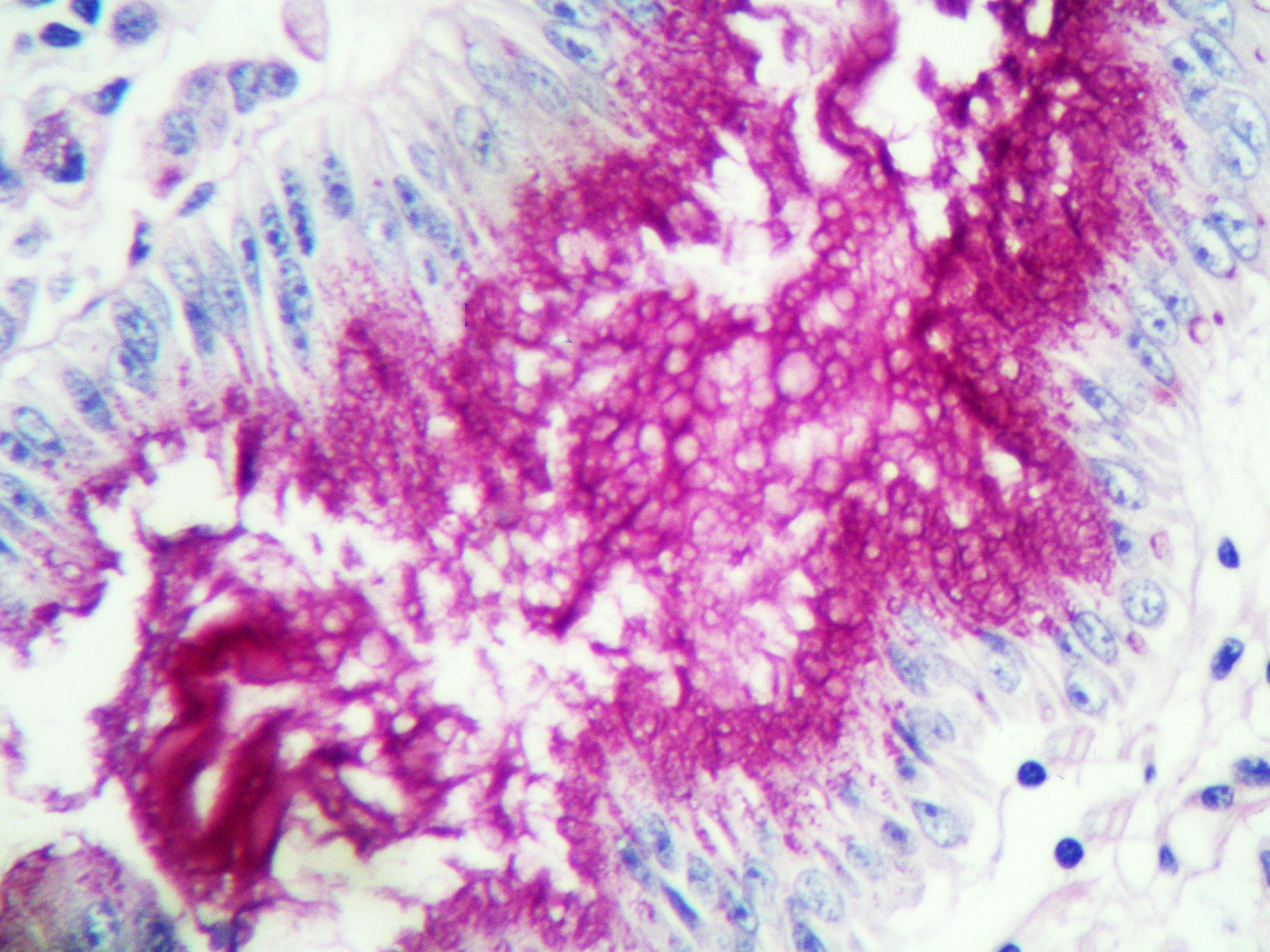 中性粘液物質(zhì)含有氨基己糖基,酸性粘液物質(zhì)也含有氨基己糖,并含有各種酸根。前者多見于胃粘膜的表面上皮,十二指腸腸腺、頜下腺和前列腺上皮等;后者多見于呼吸道和消化道的杯狀細(xì)胞、主動脈壁、軟骨基質(zhì)、角膜和皮膚等。胃粘膜表面上皮分泌中性粘液,而胃的腸腺化生或腸型胃癌細(xì)胞分泌酸性粘液,但胃型胃癌的癌細(xì)胞則分泌中性粘液。這二種粘液在蘇木素-伊紅染色時(shí)較難區(qū)分,而用(AB-PAS)染色時(shí)酸性粘液可被愛先藍(lán)染為藍(lán)色,中性粘液則可被PAS染為紅色。
