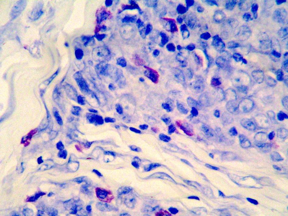 【產品介紹】肥大細胞(Mast?Cell)來源于未分化的間充質細胞,近年來有人認為可能來自胸腺和骨髓。正常多見于小血管周圍,一般在結締組織中都含有少量的肥大細胞,也常見于支氣管周圍和胰的小葉間導管周圍,而在腸系膜的小血管周圍都有大量的肥大細胞。肥大細胞較一般細胞大,直徑約20~30μm。呈圓形或橢圓形;胞核較小,圓形;胞質內充滿粗大并具有異染性的圓形嗜堿性顆粒。